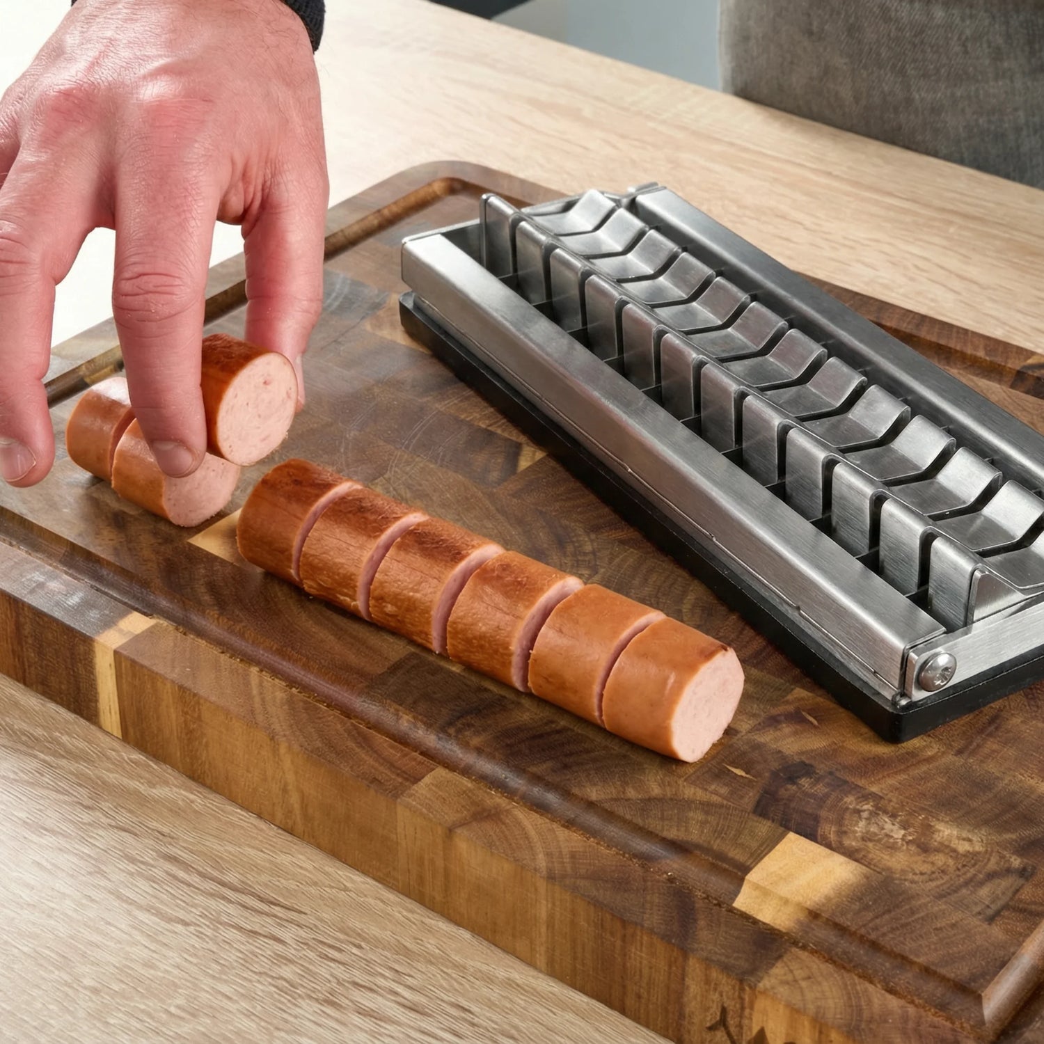 Mit einem Handgriff schneidest du gleichmäßige Scheiben, sauber, sicher und in Sekunden. Ideal für Grillabende und Gäste.