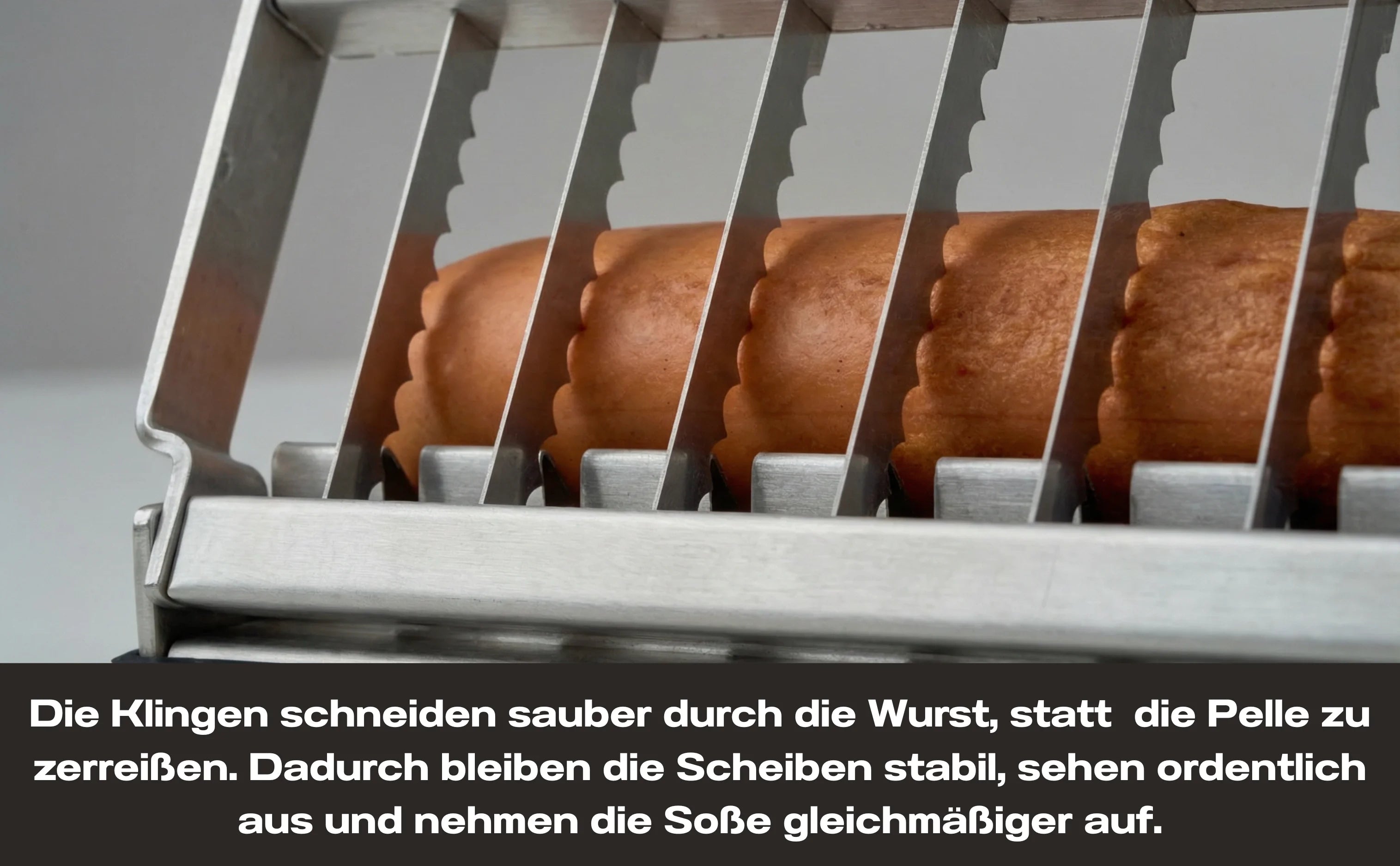 Hol dir saubere, gleichmäßige Wurstscheiben in einem einzigen Handgriff. Wenn du regelmäßig Currywurst oder Bratwurst zubereitest, weißt du: Der Schnitt entscheidet darüber, wie gut das Ergebnis am Ende aussieht und schmeckt.